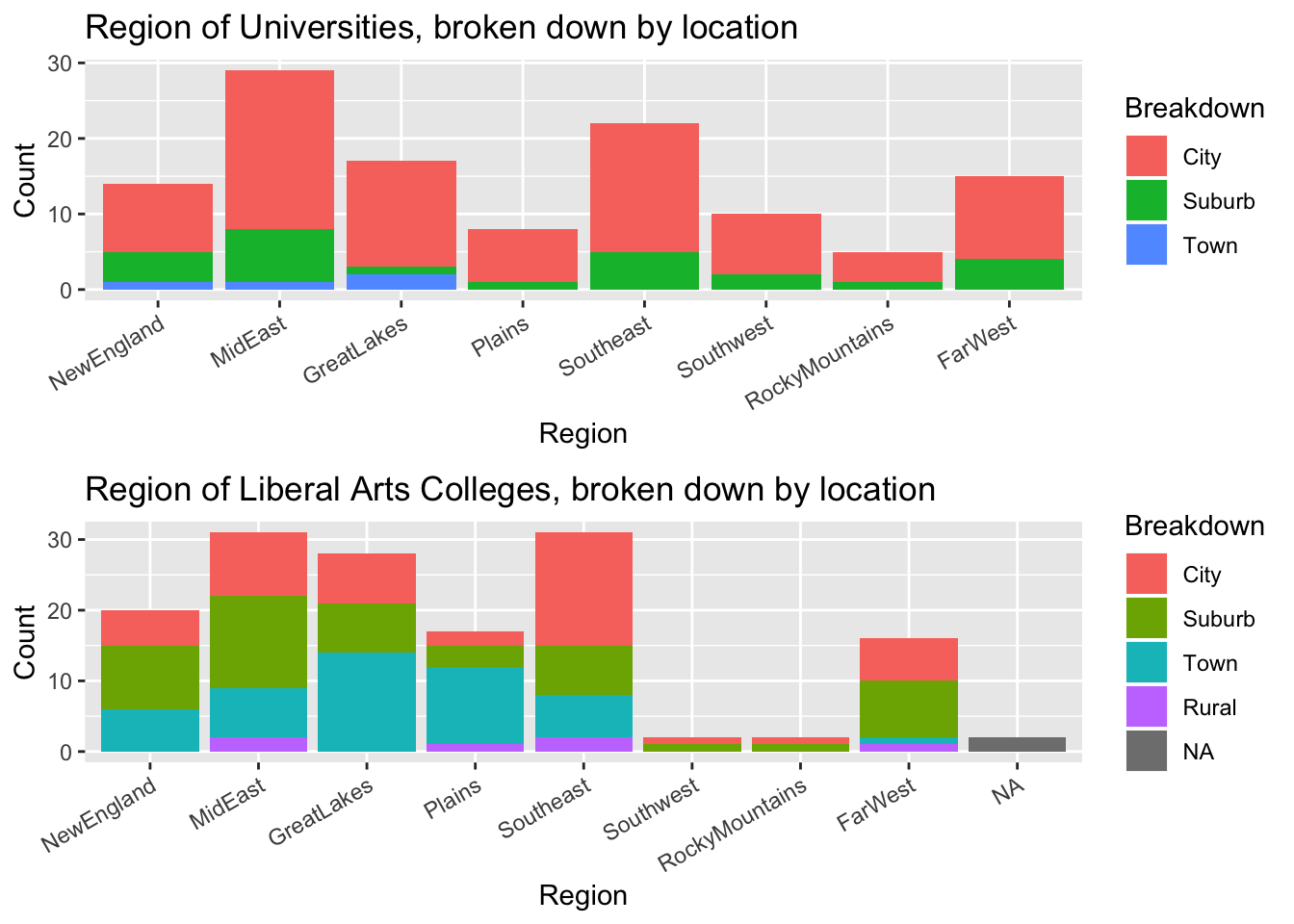 Aside from the fact that liberal arts colleges tend to have a little more variation in their setting (LOCALE) breakdown with the extra “rural” designation, we find that for universities, in all regions, a majority of the schools are in “city” locations. The largest proportion of schools are in the MidEast, then the Southeast, and then the Great Lakes region. For liberal arts colleges, there is a more even split regionally, with the MidEast and Southeast still having the most, but the GreatLakes, NewEngland, Plan, and FarWest not far behind. There are a lot of city schools (about half) in the Southeast, but otherwise, there seems to be either even splits or more schools that are in towns and suburbs.