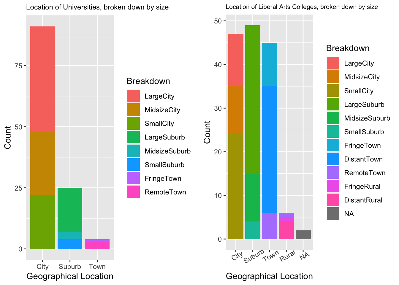In our first and second peeks, we are interested in geographical locations of universities and colleges. It might be surprising to learn that students, when choosing schools, give quite a bit of weight to a school’s geographical location. We investigate two variables that contribute to prospective students’ choices, giving side-by-side plots that reflect how the variables vary between universities and liberal arts colleges.