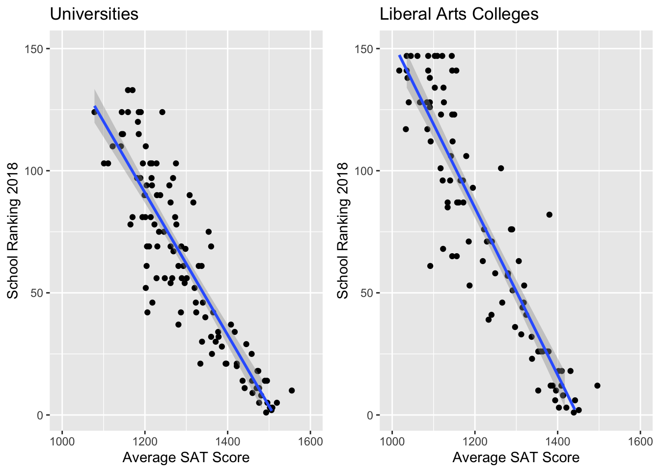 In this plot, we investigate the correlation between standardized test scores (SAT) and college ranking. From the literature and past knowledge, we believe that test scores are one of the factors that can be a marker of quality for ranking compilers. In this case, we do see a generally negative correlation between average SAT score and ranking. As SAT scores go up, rankings get smaller (better). The university scores are a bit more clustered, while there is a larger spread between the liberal arts college scores. This might be an indication of the weight put on standardized test scores for larger universities and the more holistic approach liberal arts colleges have.
