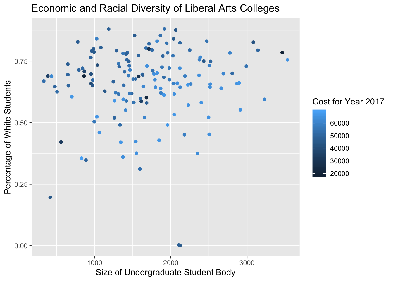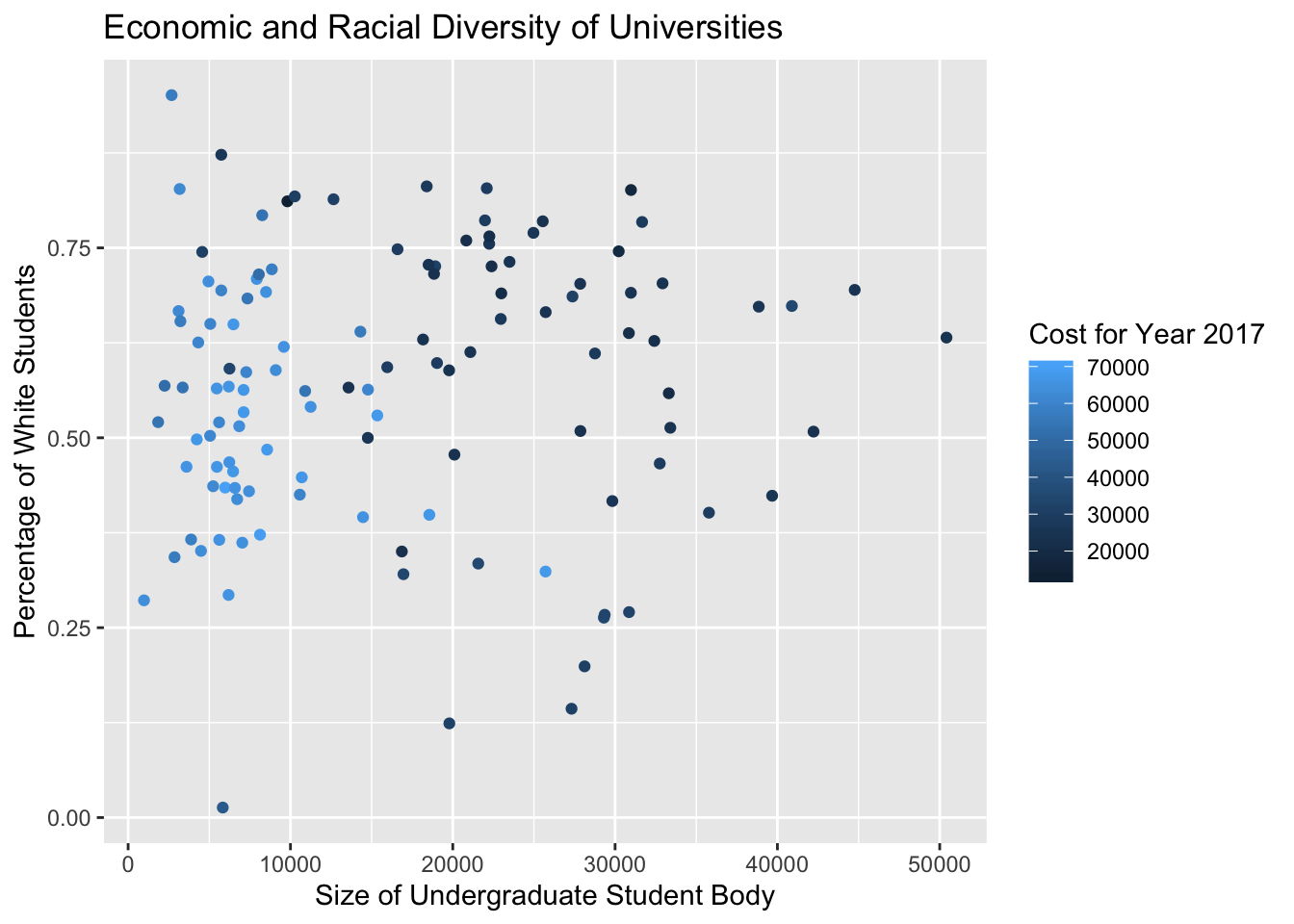 In an effort to create a more just and inclusive world, the opportunity to engage with people of different backgrounds and identities plays an increasingly important role. We plan to look into the common trend between the size of the student body and diversity factors (namely, the percentage of white students and the cost of attending college).